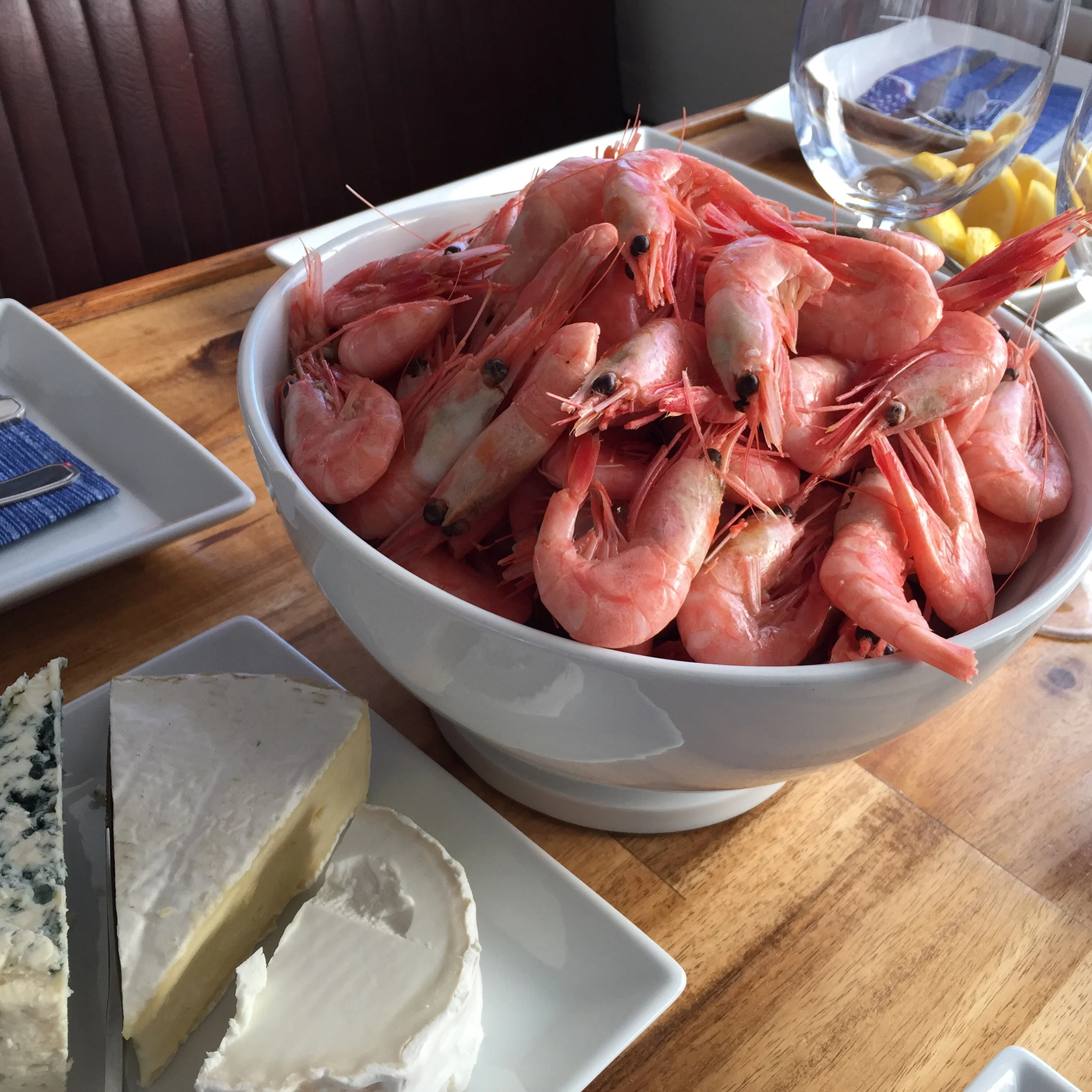 Massor av räkor, brieost, västerbottensost, ädelost, olika kex och bröd, ägg, dillmajonäs, chili-aioli och vindruvor.